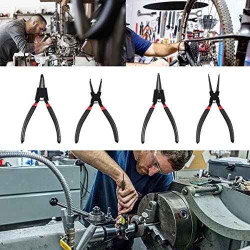 Pacchetto incluso: Il set di pinze per anelli elastici comprende 4 pinze per anelli elastici interni/esterni da 175 mm, di cui 1 pinza per anelli elastici interni dritta, 1 pinza per anelli elastici interni angolata a 90 gradi, 1 pinza per anelli elastici esterni dritta e 1 pinza per anelli elastici esterni angolata a 90 gradi.