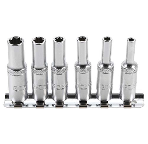 Boccole TORX E LUNGHE 1/4 Set di bussole torx femmina (profilo E) in acciaio cromato vanadio. Allenamento quadrato 1/4 (6,3 mm). Lunghezza: 50 mm. Fornito su un supporto in metallo. Dimensioni incluse: E4, E5, E6, E7, E8, E10. Marca BGS...