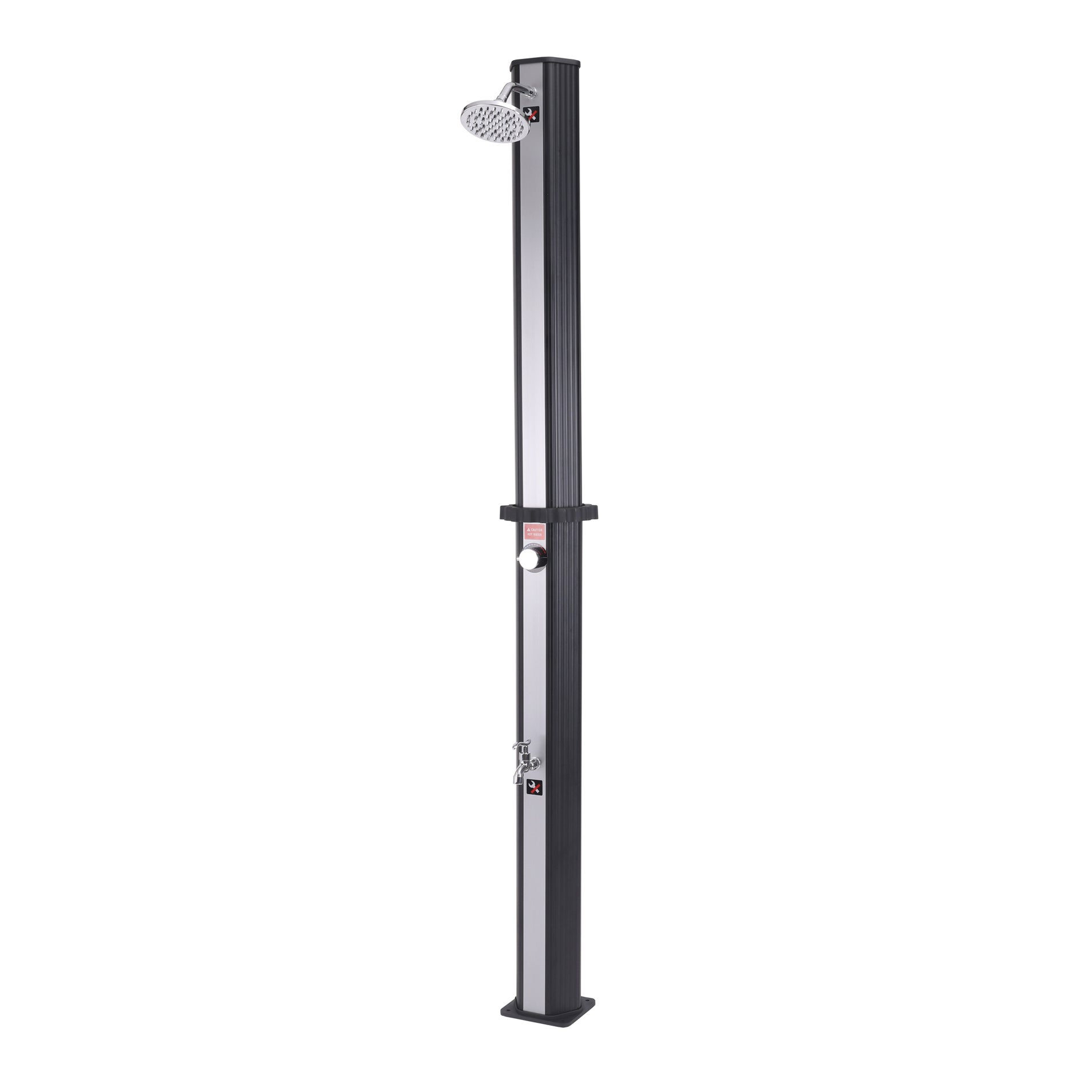 Doccia solare smontabile in PVC nero con striscia argentata 35l con rubinetto lavapiedi. Con un solo rubinetto di acqua fredda consente di riscaldare l'acqua mediante un serbatoio di accumulo sfruttando l'energia solare