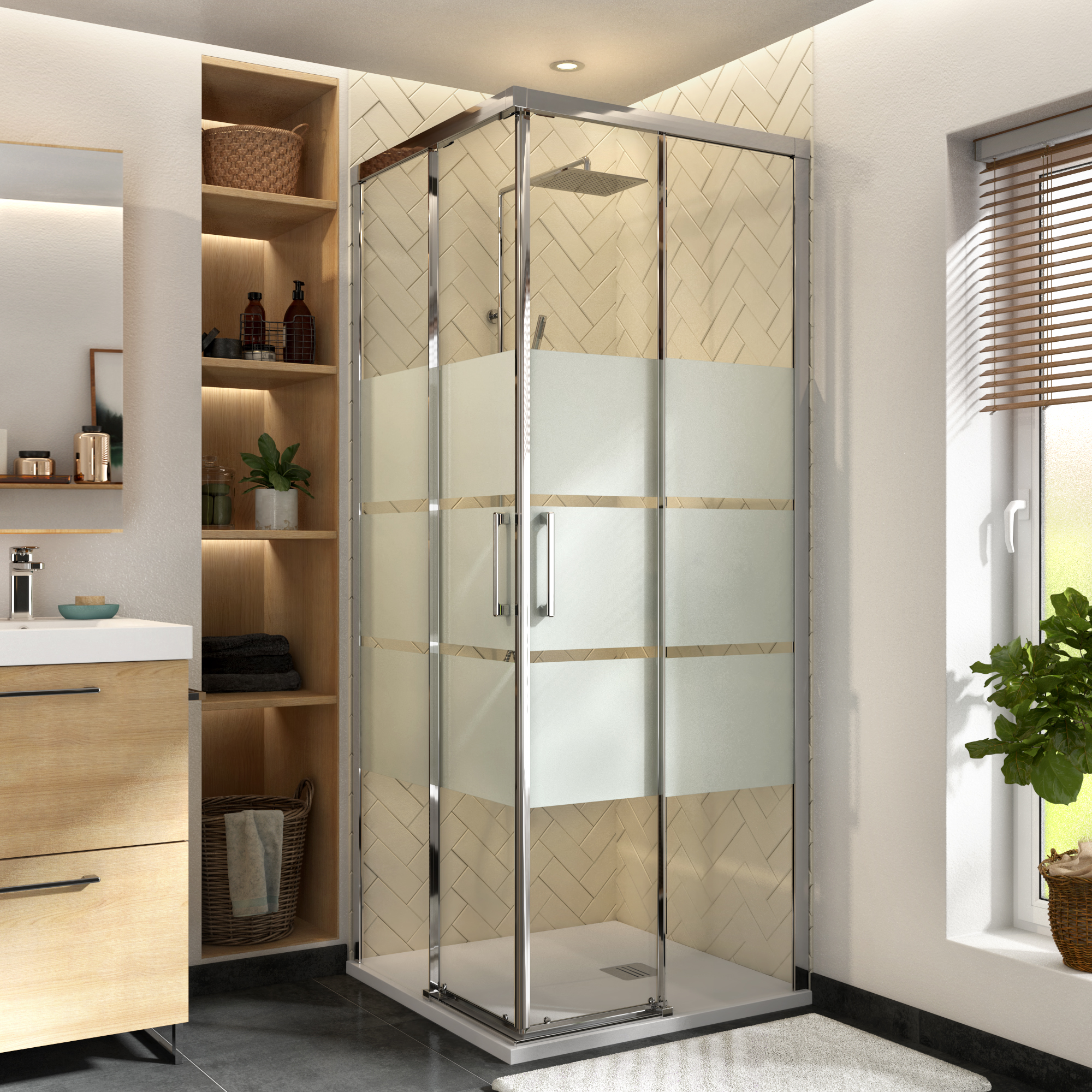 Installazione ad angolo.Ampia scelta di finiture. Robusto, stabile e durevole. L'anta sganciabile permette una pulizia facile del binario inferiore. Comodo da usare grazie alla sua maniglia ergonomica interna ed esterna