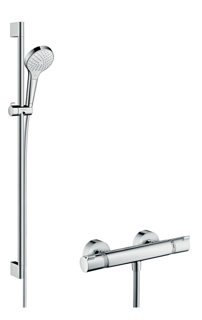 Composto da: doccetta, termostatico doccia Ecostat Comfort, asta doccia, cursore e flessibile doccia.. Pulsante Select per deviazione.. Per una manutenzione ottimale del prodotto, si raccomanda di pulire regolarmente gli ugelli e le superfici con un panno morbido, utilizzando detergenti delicati.. Dado conico lato doccia con cuscinetto per evitare la torsione del flessibile.