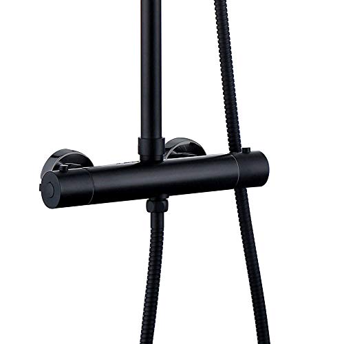 Set doccia termostatico nero opaco rotondo Tubo regolabile in altezza da 83 a 120 cm, include rubinetto termostatico, manerale, flexo e barra nera telescopica