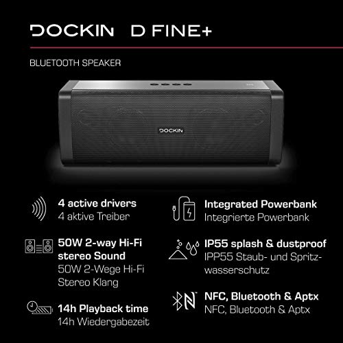 DOCKIN D FINE+ 50W Altoparlante Bluetooth Impermeabile, Cassa Senza Fili Portatile, Tempo Di Riproduzione Di 14 Ore, Powerbank, Hi-Fi Stereo Speaker, Waterproof IP55, NFC, Progettato In Germania