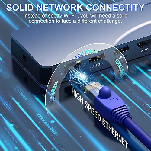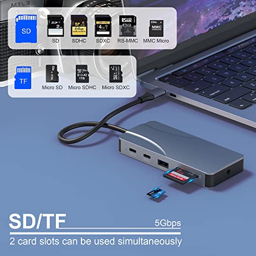 Design affidabile della porta USB per la sincronizzazione dei dati: tre porte USB 3.0 e due porte dati USB-C con velocità di trasferimento di 5 Gbps, connettiti al tuo smartphone, tablet e disco rigido per un trasferimento dati semplice, migliore opzione di connessione per mouse e tastiera cablati/wireless. L'hub Gigabit Ethernet 10/100/1000 offre un'ottima connessione di rete al posto del Wi-Fi instabile durante l'utilizzo. Adattatore USB C SD/TF da viaggio, lettura e scrittura a 5 Gbps.
