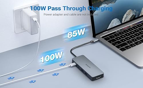 Docking station PD da 100 W: la docking station USB C di questo hub supporta il protocollo PD 3.0 può collegare un alimentatore con una potenza fino a 100 W, in modo che il laptop si ricarica ad alta velocità mentre si utilizza tutte le altre funzioni dell'hub. Si prega di assicurarsi che la porta USB-C del dispositivo supporti la funzione di ricarica.