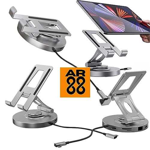 STILE E DESIGN: Questo supporto per ipad è dotato di una base girevole con un comodo design pieghevole. È possibile regolare l'altezza dell'hub usb c retrattile per avere un angolo di visuale confortevole. Il design 2-in-1 del supporto e dell'hub in alluminio trasforma il vostro iPad Pro (2018 e successivi) o accessori dispositivo USB-C in una postazione di lavoro completamente funzionale, liberandovi dal fastidio dei fili ovunque.