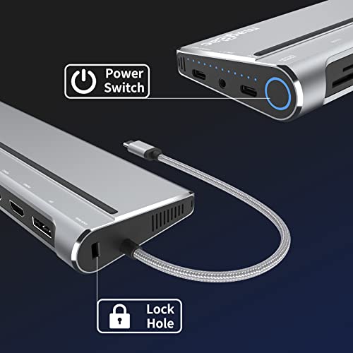 Docking station USB C 14 in 1: la docking station per laptop di tutte le estensioni da un hub USB di tipo C, riceverai due uscite HDMI 4K, 1 porta display, 1 VGA. Supporta sia la modalità estesa che la modalità a specchio, 1 porta di ricarica di tipo C PD 3.0 offre una velocità di ricarica super veloce di max. 100 W, 1 porta USB C 3.2 Gen2, 1 porta USB A 3.2 Gen2, 1 USB 3.0, 1 USB 2.0. Porta Ethernet RJ45 da 1000 m e lettore di schede SD e TF da 5 Gbps, 1 pulsante di accensione/spegnimento. 1 foro di bloccaggio di sicurezza