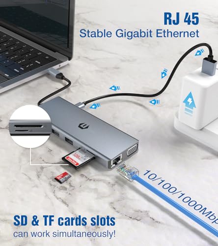 【All-powerful Laptop Docking Station】-- 12-in-1 USB C Hub Pro include porta Ethernet/RJ-45, porta di ricarica Type C PD3.0, 2 porte USB 3.0, 2 porte USB 2.0, 2 uscite video HDMI con risoluzione 4K, VGA, e lettore di schede SD & TF. Porta Mic/Audio in un design estremamente compatto ed elegante. Assicurati che il tuo laptop abbia porte Thunderbolt 3 / USB-C 3.1 Gen 2 / USB-C 3.2 Gen 2 prima di acquistare.