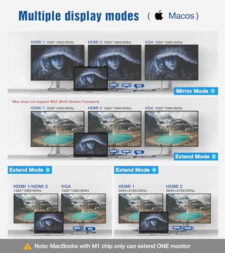 【Modalità Mirror/Non-Mirror su sistema Mac Os】-- Il sistema Mac OS non supporta MST. Si può godere di un contenuto di visualizzazione privata sul vostro computer portatile e condividere tutti i monitor esterni con un altro contenuto di visualizzazione. Dual HDMI supporta fino a 4K (3840x2160@30Hz) sul sistema Mac OS. La risoluzione è 1920x1080@60Hz quando si usa VGA.