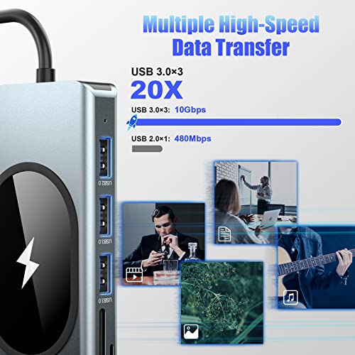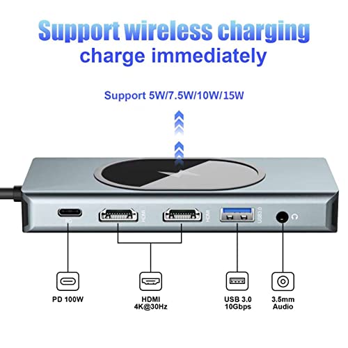 Docking Station USB C, Ricarica Wireless Hub USB C 12 in 1 Adattatore Multiporta Doppio HDMI Display Triplo con Doppio HDMI 4k, VAG, 3*USB3.0(10Gbps), USB2.0, 1000M Ethernet, 100W PD, TF/SD, Audio