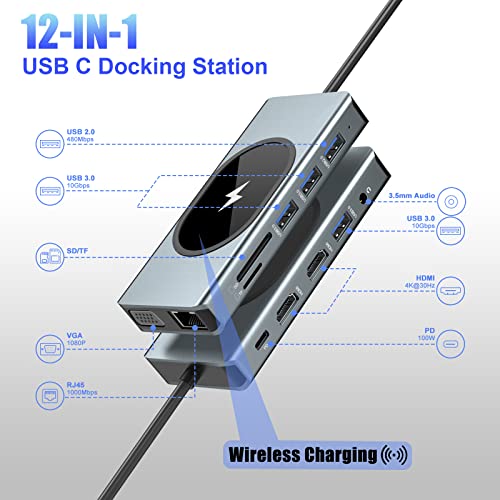 ♥Docking station USB C 12 IN 1: doppie porte HDMI 4K a 30 Hz con ricarica wireless, porte VAG 1080P, 3 porte USB 3.0 (10 Gbps), USB 2.0 (480 Mbps), 100 W PD, Gigabit Ethernet, TF/SD, audio da 3,5 mm, Nessun driver o software, uso Plug and Play.