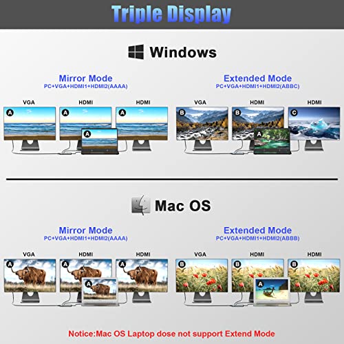 ♥Uscita 4K Ultra HD con triplo display: doppio HDMI e VGA È possibile visualizzare il contenuto del notebook su 3 monitor, risoluzione HDMI fino a 4K a 30 Hz, risoluzione VGA 1920 x 1080P, quando si utilizzano sia HDMI che VGA, la risoluzione è unificata a 1080P L'immagine è lo stesso per 3 monitor su un Apple Notebook (MAC OS) in modalità mirroring e modalità estesa.