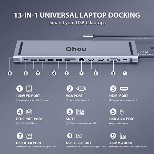 Docking Station 13 in 1 ad alte prestazioni. La dock USB C Qhou 13 in 1 dispone di tutte le funzioni necessarie nella vita quotidiana e nel lavoro generale, tra cui 2 HDMI, Ethernet, USB 3.0 USB C 3.0, USB 2.0, scheda SD/TF, slot audio e microfono da 3,5 mm e 1 uscita PD (tipo C) per ricaricare il vostro telefoni.