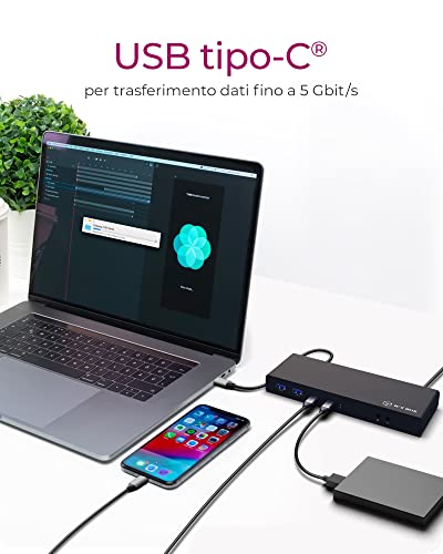 USB La docking station è dotata di due porte USB Type-A e Type-C frontali, che consentono una velocità di trasferimento fino a 5 Gbit/s. Sul retro sono disponibili due porte Type-A.