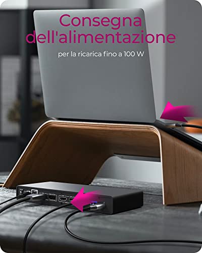 POWER DELIVERY È possibile caricare il computer host in viaggio grazie a Power Delivery (65 W), a condizione che l'alimentatore esterno sia collegato alla docking station. Ciò consente di risparmiare spazio, poiché è necessario trasportare solo un alimentatore.