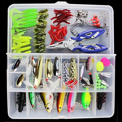 Includere esche dure di plastica, esche silicone morbido, esche paillettes, pinze di pesca, anelli di guida, ami da pesca e altri accessori, 100 pezzi in totale.