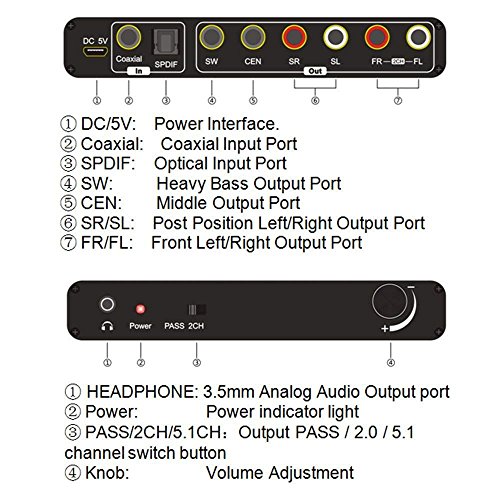 [Super fast Reaction] Avvia entro 3 secondi, passa automaticamente dall'ingresso del canale ottico a quello coassiale, un interruttore a un tasto per uscita Pass / 2.0, decodifica automatica del segnale di ingresso AC-3 / DTS (LPCM / PCM / RAW) senza alcuna azione.