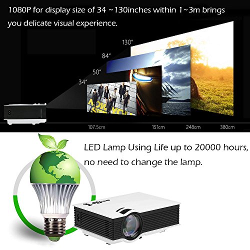 [alto lumen e alta risoluzione] 1200 lumen garantisce immagini chiare e luminose. Risoluzione massima fino a 1080p per la dimensione di visualizzazione di 34 ~ 130 inches entro 1 ~ 3 m vi offre un' esperienza visiva delicata.
