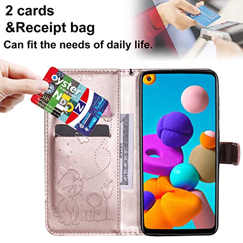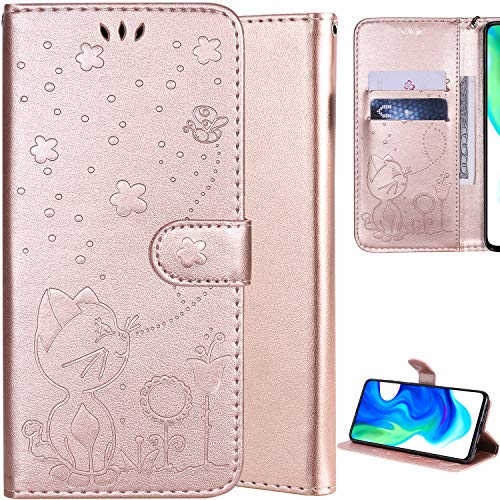 DodoBuy Custodia per Oppo A9 2020/A5 2020, Modello Gatto Flip Folio in Pelle PU Cuoio Wallet Case Cover Supporto Credito Carta Titolare Chiusura Magnetica Cinturino da Polso - Oro Rosa