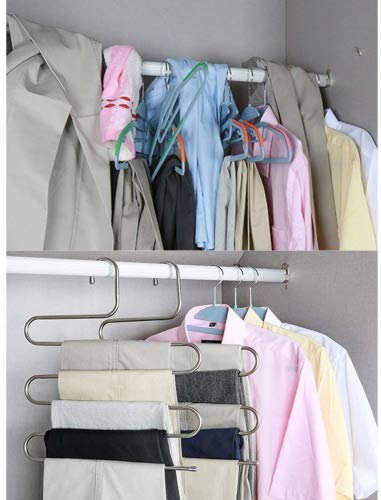 Gruccia appendiabiti per 5 paia di pantaloni, per risparmiare spazio. Ogni gruccia può contenere almeno 5 Jeans, pantaloni o altri indumenti. Sfruttalo al meglio per guadagnare spazio nel guardaroba e mantenerlo in ordine. Alta resistenza e difficilmente deformabile.