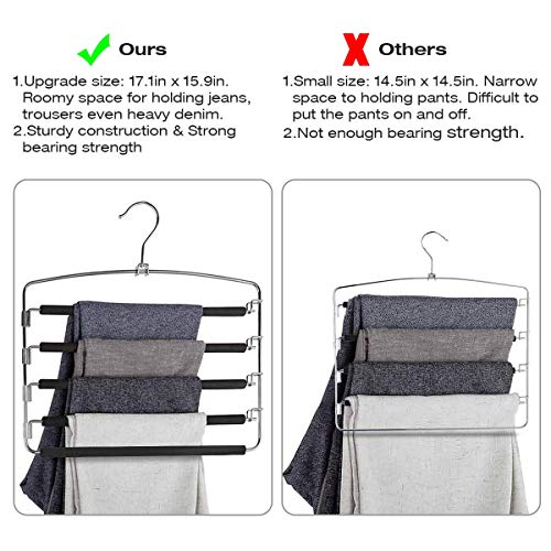 Gruccia appendiabiti per 5 paia di pantaloni, per risparmiare spazio. Ogni gruccia può contenere almeno 5 Jeans, pantaloni o altri indumenti. Sfruttalo al meglio per guadagnare spazio nel guardaroba e mantenerlo in ordine. Alta resistenza e difficilmente deformabile.