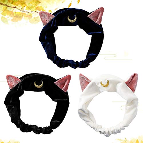 DOITOOL, fascia per capelli da donna, 3 pezzi, per orecchie di gatto, adorabile fascia elastica per il trucco, il viso, lo yoga (nero + bianco + blu navy)