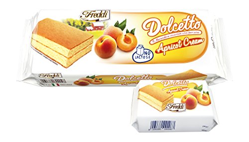 Soffice merendina in pan di Spagna con ripieno di crema all'albicocca ^ Senza lattosio e con meno di 100 kc a porzione ^ Senza conservanti e coloranti. Solo aromi naturali