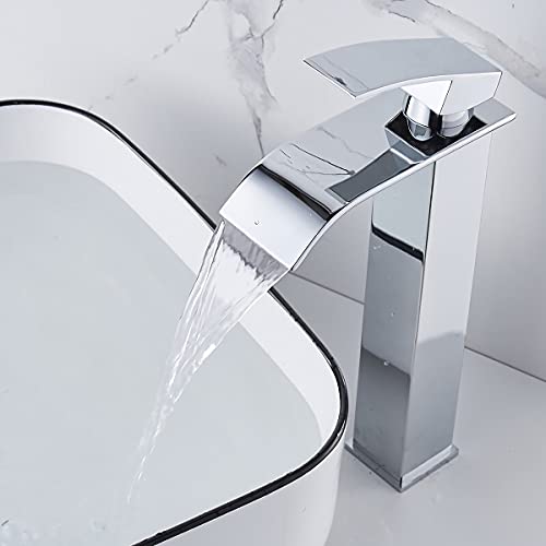 Dolinvo Rubinetto Cascata Alto Bagno Lavabo Miscelatore Monocomando da Appoggio Lavandino Bagno 304 Acciaio Inox Cromato Argento Lucido Acqua Fredda e Calda Valvola Ceramica senza Nichel e Piombo