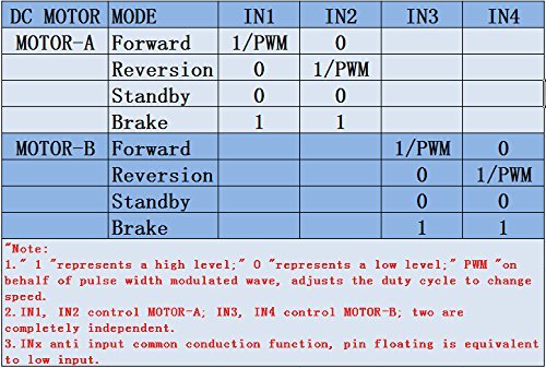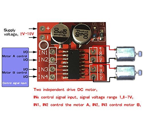 Tensione di alimentazione 2 V ~ 10 V, può pilotare due motori DC o un motore passo-passo bifase a 4 fili, può raggiungere la rotazione in avanti o la rotazione inversa, è possibile regolare la velocità di rotazione. Ciascuno può fornire corrente continua di 1,5 A, corrente di picco fino a 2,5 A, protezione termica e può essere ripristinato automaticamente.