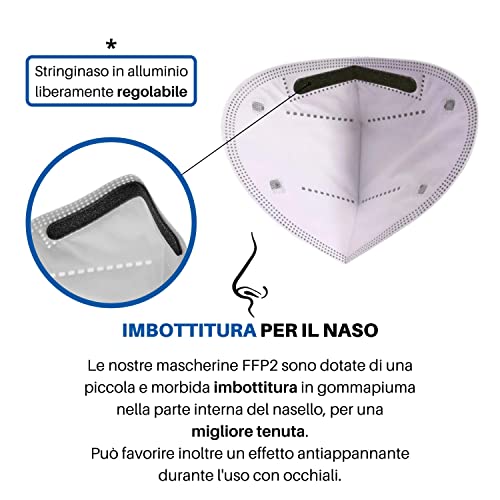 ✅ SICUREZZA e AFFIDABILITA': Le nostre mascherine FFP2 NR monouso sono altamente filtranti (BFE ≥ 95%) e risultano perfette per la protezione da polvere, polline e altre particelle solide e organiche. Vengono fabbricate e sottoposte a sanificazione UV seguendo i più alti standard di sicurezza europei e internazionali in materia di dispositivi medici, in modo da offrirti un prodotto sicuro ed efficace