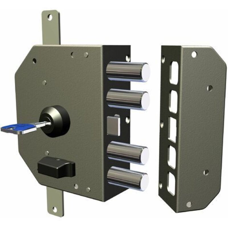 Art. 3250 K55 chiusura triplice con scrocco e 4 catenacci. Comando interno con pomolo. Mano DX Scatola verniciata mm 130x164 Lunghezza cilindro 60 mm (70 e 80 mm a richiesta) Entrata 60 mm