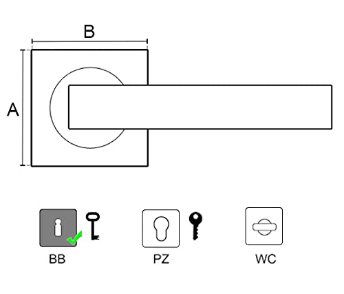 Dimensioni (altezza A/larghezza B) in mm: 51/51 - Il set di maniglie è utilizzato in ambienti interni in molte case e uffici. Questo set di maniglie per porta dispone di una rosetta BB, PZ o WC/bagno per una porta della camera (vedi varianti, disponibile anche senza rosetta). Serve anche per abbellire porte e interni. Il perno quadrato è massiccio e realizzato in acciaio di alta qualità.