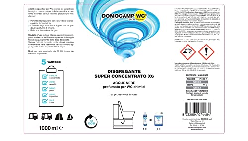 DOMOCAMP WC SEI VOLTE SUPERCONCENTRATO 1 LT VALE 5 LITRI Liquido Disgregante - FLACONE DOSATORE - per Serbatoio Camper, Gabinetto da Campeggio, Acque Nere 100% BIODEGRADABILE