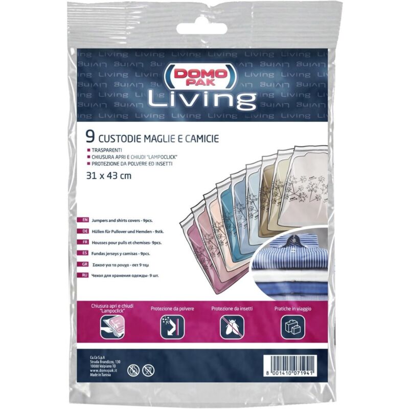 DOMOPAK - 9PZ CUSTODIE PER MAGLIE E CAMICIE 31X43CM ANTIPOLVERE & PROTETTIVI: studiati per mantenere i tuoi vestiti puliti e proteggere i tessuti più delicati da sporco, polvere, insetti e liquidi. Puoi dire addio alla polvere sul tuo maglione preferito PER UN ARMADIO ORGANIZZATO: sigilla i tuoi indumenti nelle buste per un armadio sempre pulito e ordinato. La soluzione pratica e intelligente per organizzare armadi, cassetti e tutto ciò che desideri CHIUSURA RAPIDA grazie alla speciale zip Lampoclick, ideata per garantire una chiusura perfetta, pratica e semplice. Sigilla i tuoi vestiti per mantenerli puliti e profumati a lungo, come appena lavati MULTIUSO & RIUTILIZZABILI: pensati non solo per uso domestico ma anche per gli sportivi e per chi ama viaggiare. 100% BPA Free e massima durata nel tempo per molteplici utilizzi e nessuno spreco.