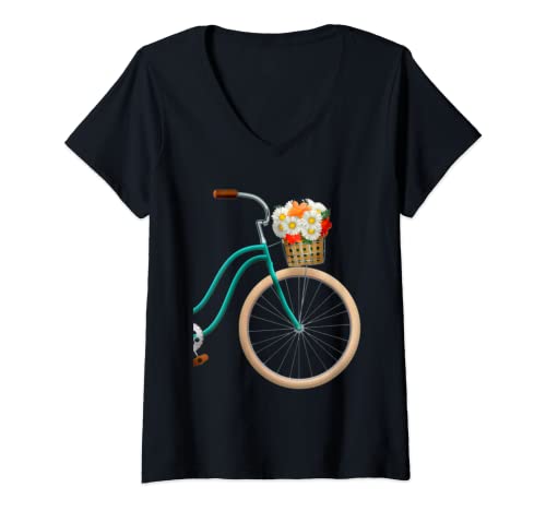 Donna Bicicletta da donna con cesto di margherite. Maglietta con Collo a V