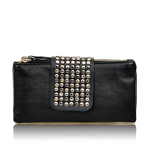 Donna Borsa Pochette Borsetta Zip in PU Cuoio Nero con Borchie da Ufficio