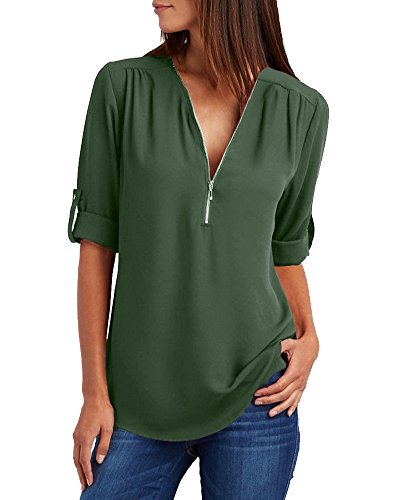 Donna Camicetta Magliette Scollate Blusa Elegante Chiffon Camicia con Manica Regolabile Esercito Verde 5XL