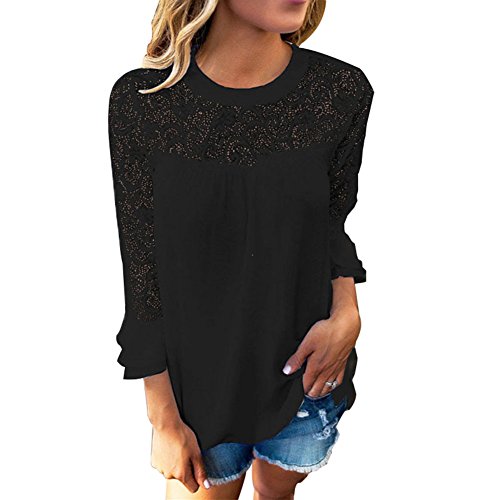 Donna Camicia Chiffon Blusa, BAINASIQI T-shirt Maglia Lunga Casual Elegante Pizzo Maniche Camicetta Tops Shirt Ufficio Girocollo (M, Nero)