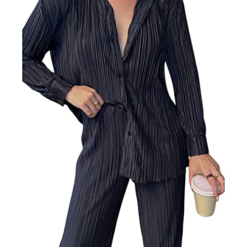 Set da donna casual a 2 pezzi, camicia a pieghe con bottoni a maniche lunghe + pantaloni, Nero, L