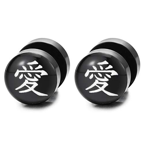 Uomo Donna Nero Cerchio Orecchini con Carattere Cinese del Ai Amore, Finto Dilatatore Fake Cheater Plug Gauges, Acciaio