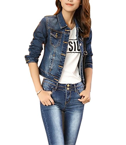 Donna Classico Giacca di Jean Corto Slim Fit Denim Jacket a Manica Lunga