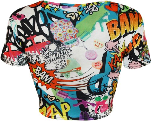 Donna Comic Cartoon graffiti stampa tondo da donna a maniche corte, crop top - taglie 8 - 14