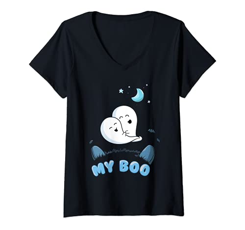 Donna My Boo Love Couple Boo Ghost Halloween Valentine's Day Maglietta con Collo a V