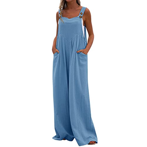 Tuta da donna elegante lunga - Salopette estiva da donna, a gamba larga, tuta intera con spalline, tinta unita, pantaloni estivi in lino, gamba lunga con tasca, Blu, S