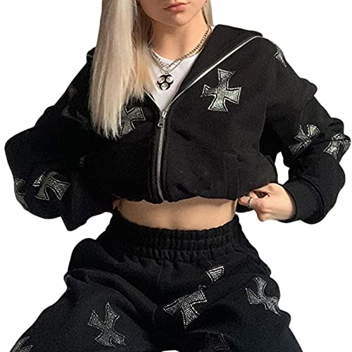 Donna Y2K Felpa con Cappuccio per Le Donne Pullover Sport Jumper Primavera Felpa di Colore Solido Lettera Stampa Zip Up Manica Lunga Hoodie con Tasche(Nero1, M)