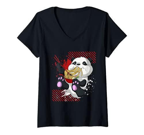 Donna Kawaii Panda Animale Otaku Giappone Tagliatelle Di Ramen Maglietta con Collo a V