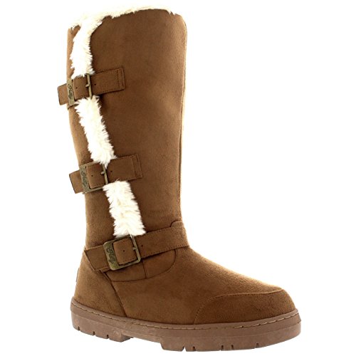Donna Alto Three Buckle Foderato di Pelliccia Impermeabile Inverno Pioggia La Neve Stivali Interna - Marrone Chiaro - UK7/EU40 - BA0471
