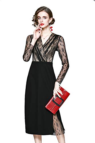 LAI MENG Donna Vestito Patchwork-Design Elegante Manica Lunga Lungo Abito da Sera EU 34-40