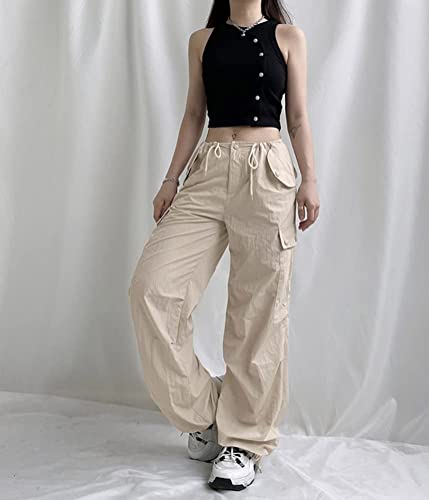 Donne Y2k Baggy Cargo Pantaloni Pantaloni Casual Elastico in Vita Larga Gamba dritta Tie-Up Tasche laterali Estetico Streetwear Estate (Colore: X1 Kaki, Taglia: S)