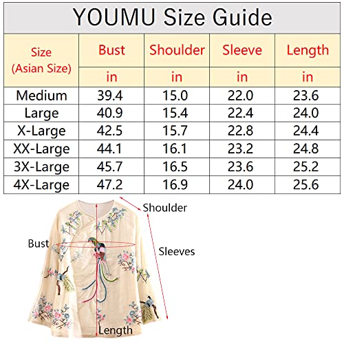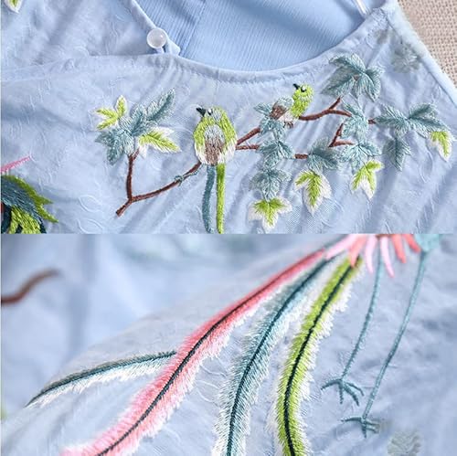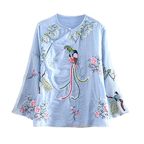 Donne Cinese Pavone Ricamo Floreale Etnico Crop Camicetta Camicia 3/4 Maniche Qipao Rana Pulsante Top Retro, A-blu, 3XL